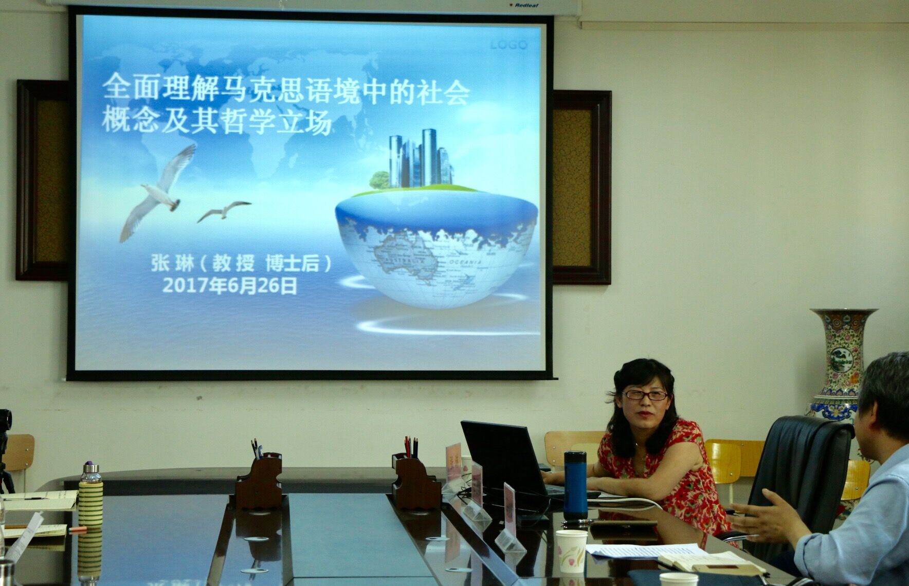 张琳教授就马克思语境中的社会概念及其哲学立场进行了全面的理解和阐释。张琳教授以当代世界发展的大背景入手,提出了目前全球性贫富差距背后对“社会”概念解读的忽视所导致的问题,由此进入报告会的主题,分四部分对马克思语境中的社会概念进行了诠释,并呼吁要全面地对公共领域进行建设,不要在建设过程中丢掉对社会全面发展性的理解。