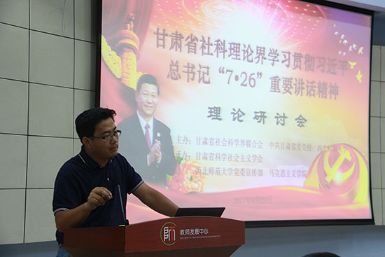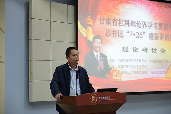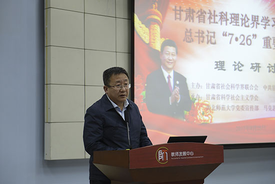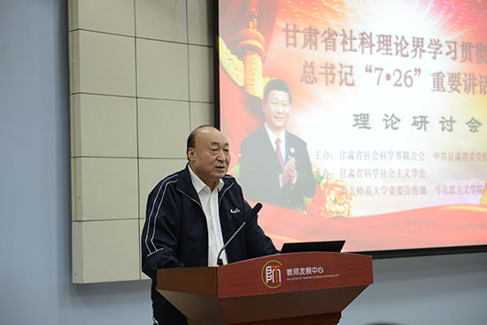 甘肃省社科联党组书记、常务副主任冯湖教授在致辞中指出,习近平总书记“7·26”重要讲话是马克思主义中国化最新成果,开辟了当代中国马克思主义发展新境界,全省社科界都要深入学习和贯彻好讲话精神。要充分认识讲话的重要意义,深刻领会讲话的丰富内涵,以习近平总书记系列重要讲话精神和治国理政新理念新思想新战略为科学指引和根本遵循,立足中国特色社会主义发展的新阶段,牢牢把握我国发展的阶段性特征,深化理论研究,加强组织领导,增强宣传力度,自觉在理论上拓展新视野。