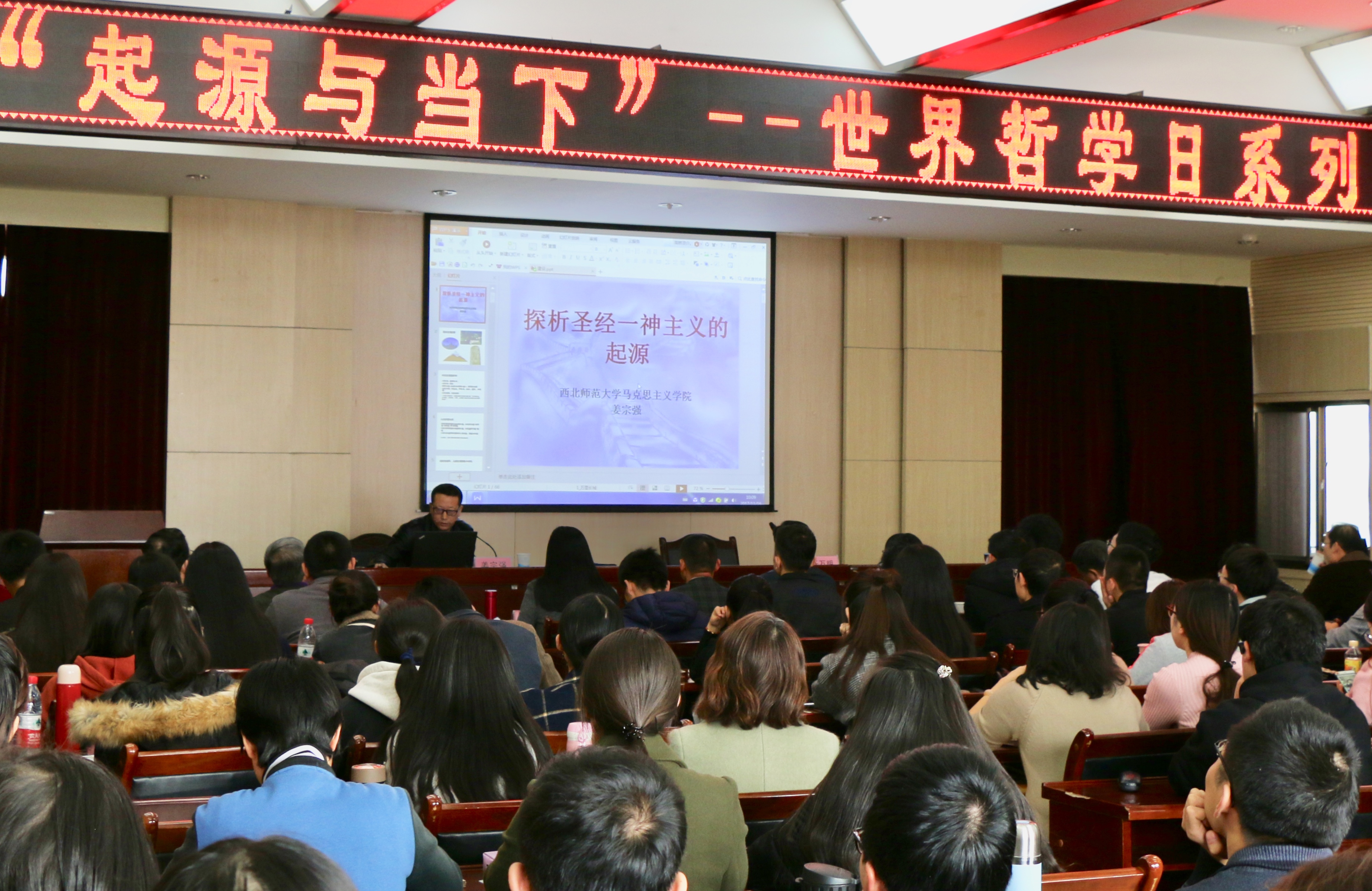 2017年11月10日,由bv伟德国际1946哲学系主办的“世界哲学日系列讲座”在bv伟德国际19464楼学术报告厅举行,本次的主题为“起源与当下”,分上下午总共进行了四场报告,先后由bv伟德国际1946姜宗强副经理、贺更粹副教授(上午场);朱海斌博士和哲学系主任贾克防副教授(下午场)主讲。上午场由任万明副教授主持,下午场由师庭雄副教授主持。甘肃省委党校岳海湧教授、伟德国际1946官方网站传媒公司杨光祖教授、bv伟德国际1946王金元教授、周红教授、吴琼副教授以及各位教师、员工爱好者共百余人参加活动。