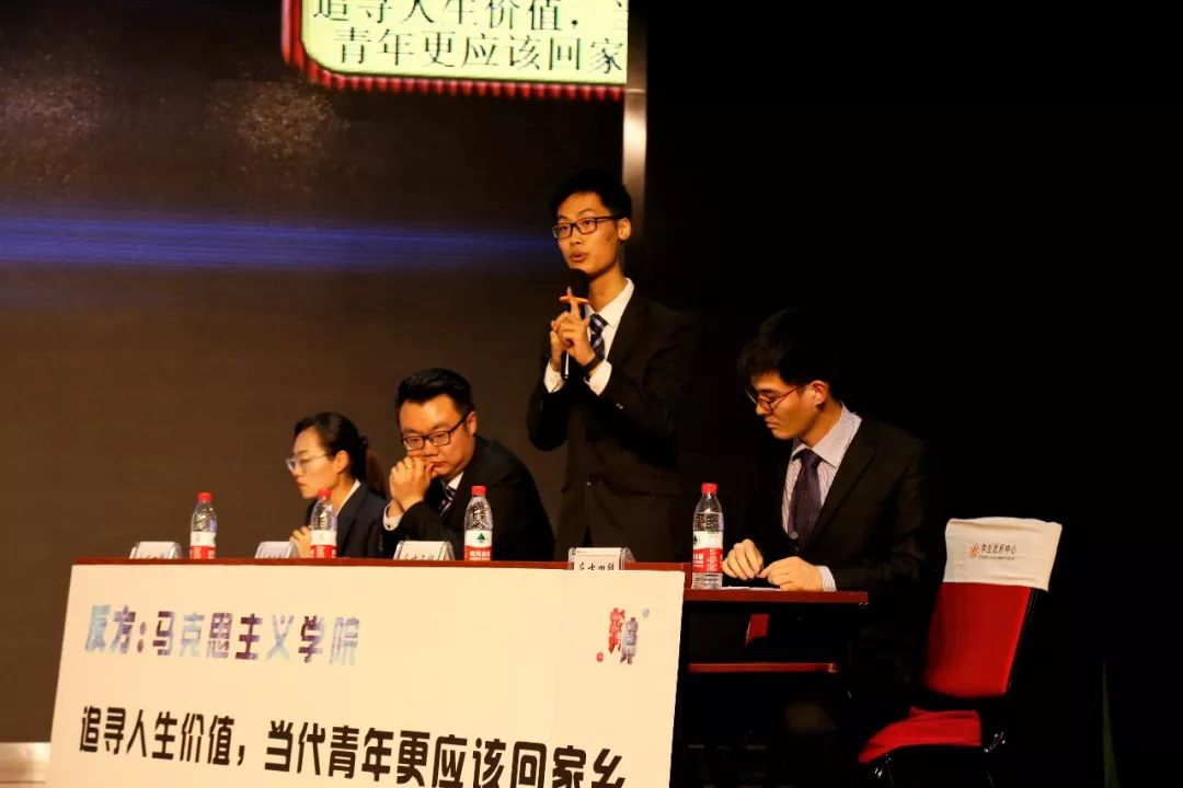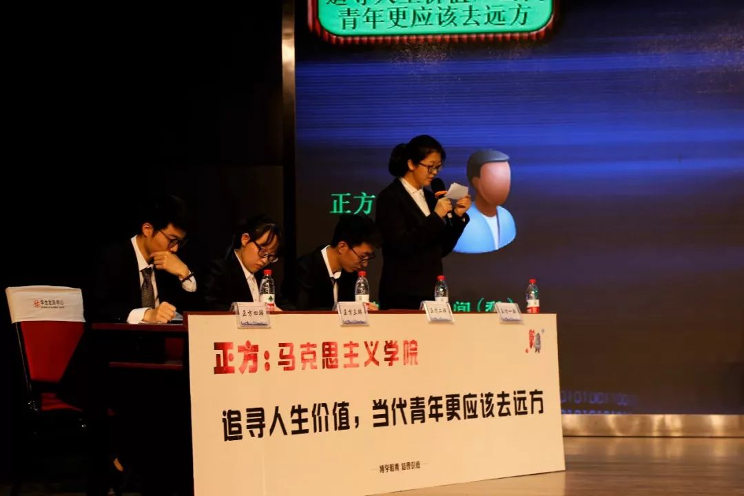 决赛分本科生和研究生两场依次开展,围绕"追寻人生价值当代青年更应该去远方(正方)还是回家乡(反方)"这一辩题展开辩论。