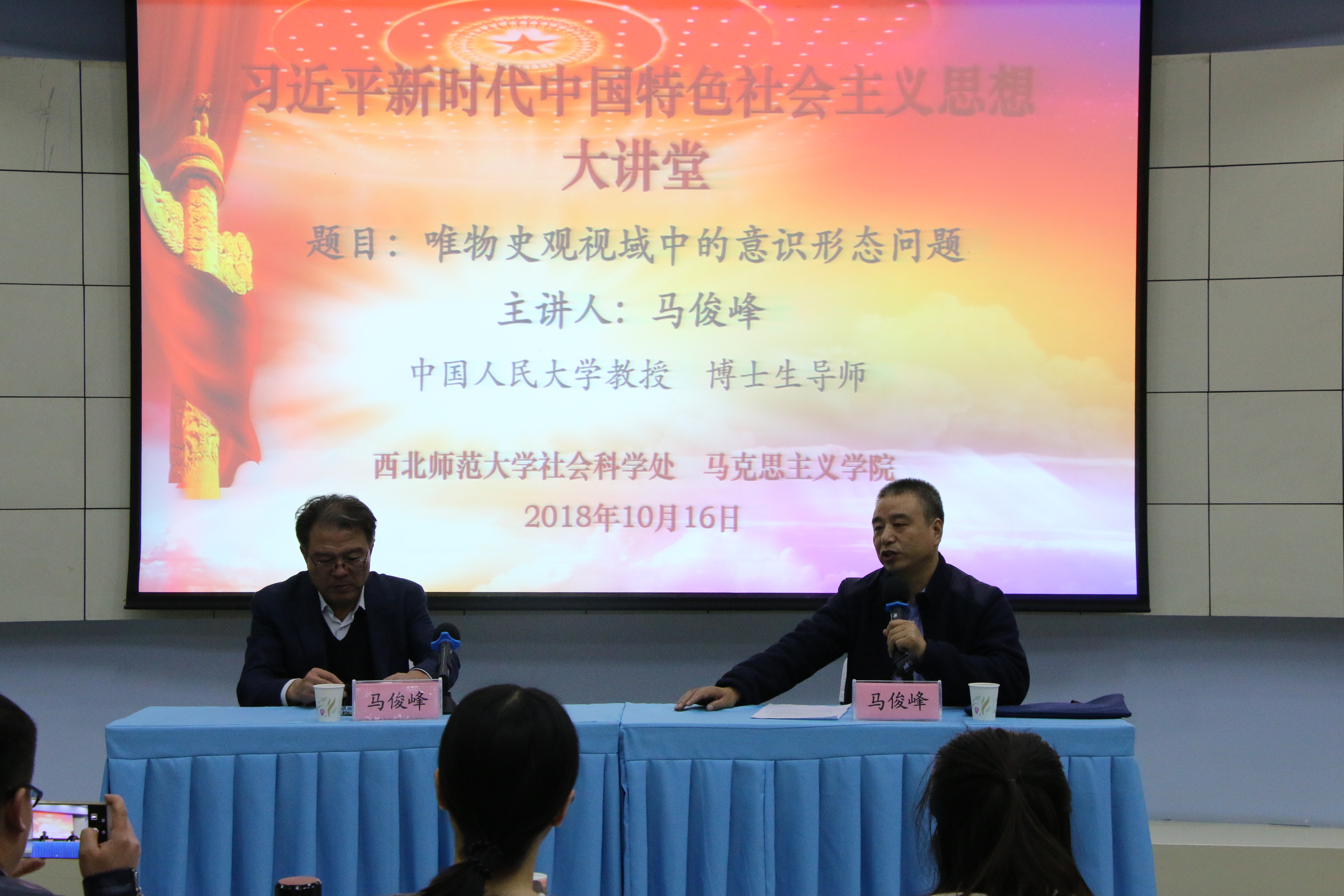 2018年10月16日下午3点,bv伟德国际1946“习近平新时代中国特色社会主义思想大讲堂”第五讲在教师发展中心二楼会议厅举行。中国人民大学教授、博士生导师马俊峰教授应邀作了题为“唯物史观视域中的意识形态问题”的讲座, 讲座由bv伟德国际1946副经理马俊峰教授主持,公司博、硕研究生100余人参加了本次活动。