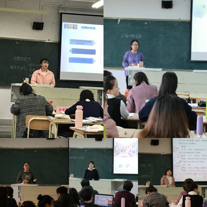 吴文房、胡丹丹、牟文杰等十名“本硕一体化”学科思政专业的员工分别依据中学教材就“正确对待金钱”、“树立正确的消费观”、“货币的基本职能”、“财政收入与财政支出”等问题进行了10分钟的教学展示。
