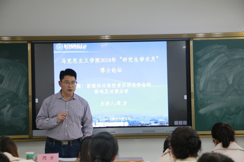 2018年11月9日晚,2018年“研究生学术月”博士论坛在教学7号楼510教室举行。周方博士作题为《新媒体对高校意识形态安全的影响及对策分析》的报告,公司博、硕研究生参加了本次报告。