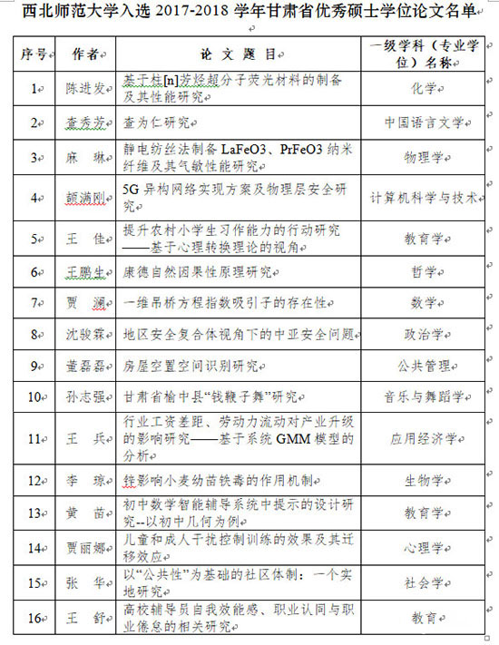 近日,甘肃省学位委员会、甘肃省教育厅公布2017-2018学年年甘肃省优秀博士、硕士学位论文名单,公司哲学专业2015级研究生王鹏生的毕业论文《康德自然因果性原理研究》和政治学理论专业2015级研究生沈骏霖的毕业论文《地区安全复合体视角下的中亚安全问题》被评为2018学年甘肃省优秀硕士学位论文。