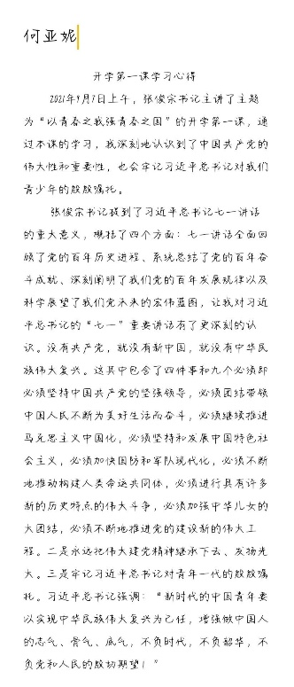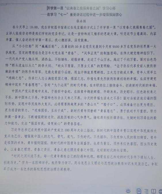 2020级思想政治专业张俊江同学表示:通过观看公司以“七一”讲话精神为主题的开学第一课直播,我深深地为我们欣欣向荣的国家而感到荣耀、为我们不断求索、不断前进的政党而感到骄傲,更为能够投身充满机遇和挑战的现代化建设而感到自豪。