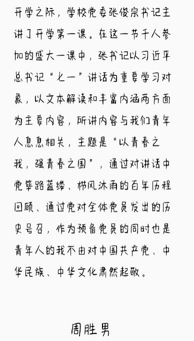 张俊宗书记的“开学第一课”给予我们青年学子极大的鼓舞,站在新的历史起点,回首来时路,百年征程何其伟大,实现中华民族的伟大复兴任重道远,我们仍需不懈努力,为师大增光添彩,为中国梦的实现贡献青春正能量!