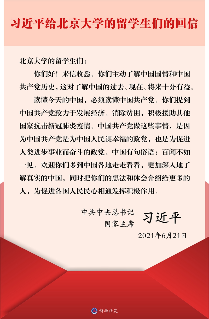 读懂今天的中国,必须读懂中国共产党。你们提到中国共产党致力于发展经济、消除贫困,积极援助其他国家抗击新冠肺炎疫情。中国共产党做这些事情,是因为中国共产党是为中国人民谋幸福的政党,也是为促进人类进步事业而奋斗的政党。中国有句俗语:百闻不如一见。欢迎你们多到中国各地走走看看,更加深入地了解真实的中国,同时把你们的想法和体会介绍给更多的人,为促进各国人民民心相通发挥积极作用。