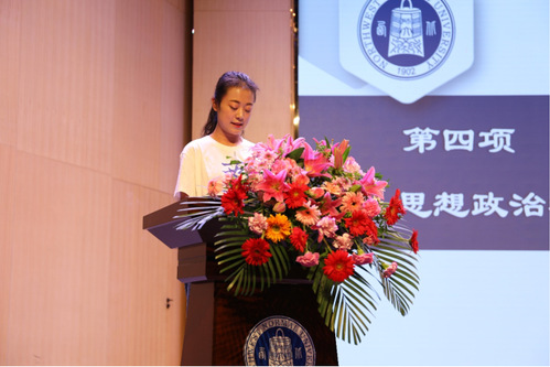 2021级思想政治教育专业研究生刘莹雪同学代表研究生发言。刘莹雪结合个人经历进行了满怀真诚的分享,号召新学子们:在马信马,做马克思主义理论的坚定信仰者;在马学马,做马克思主义理论的踏实求索者;在马宣马,做马克思主义理论的有力传播者。