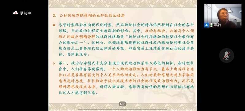 5月11日下午,南开大学谭融教授线上为公司作了题为《关于后发国家政治转型与政治发展的理论阐释》的学术讲座,校内外师生百余人参加。