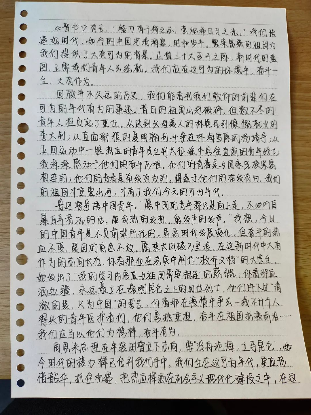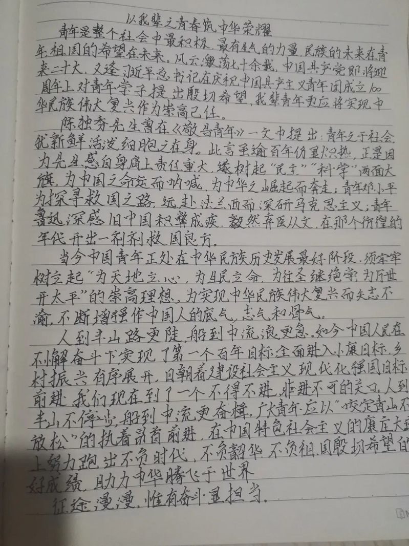 李文芃同学分享到,如今时代的接力棒已传到我们手中,我们更应珍惜韶华,抓住机遇,把热血挥洒在社会主义现代化建设之中。在这可为的时代下施展才华,在时代的熔炉里淬炼成钢,书写绚烂无悔的青春年华,唯有尽心竭力,方不负先辈之托。