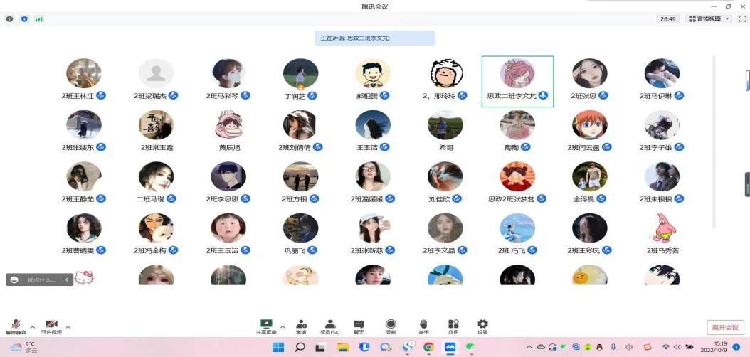 10月9日下午,2022级思政2班召开了以“青春献礼二十大,强国有我新征程”为主题的线上读书会。此次会议由丁润芝同学主持,参会人员有郝相赟老师、李颖老师以及2022级思政2班全体成员。在会上,大家一起重温了习近平总书记《在庆祝中国共产主义青年团成立100周年的讲话》,随后大家就新时代青年的责任与担当问题展开激烈的讨论,同学们踊跃发言,现场气氛十分活跃。