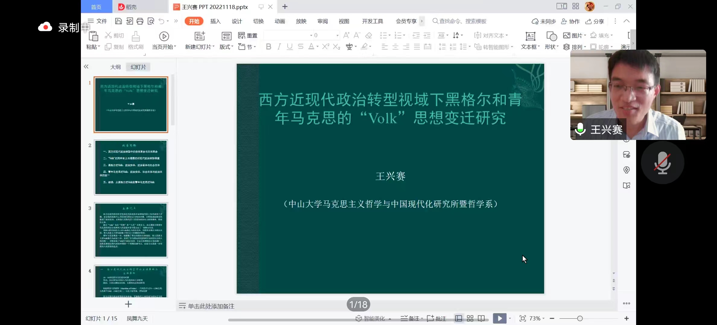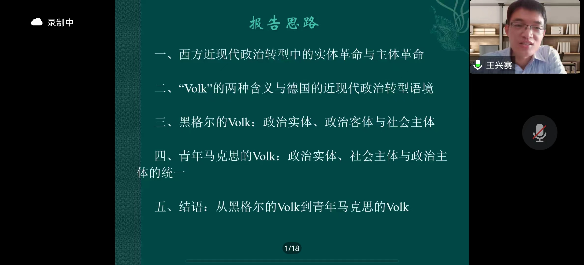 接下来,王兴赛副研究员沿着马克思的博士论文、《黑格尔法哲学批判》、《<黑格尔法哲学批判>导言》、《共产党宣言》等文本考察了青年马克思的Volk概念。他认为,在马克思那里,Volk是指作为市民社会的现实的人民。青年马克思所说的现实的人民(das wirkliche Volk)内含了作为市民社会的人民和作为国家的民族,因而青年马克思的Volk实现了民族国家(nation-state)和人民(people)的统一,由此也就实现了政治实体、政治主体与社会实体的统一。在此基础上,他分析了黑格尔的Volk与青年马克思的Volk之间的联系和区别。黑格尔的Volk的局限性在于:一方面,黑格尔规定民族(Volk)作为国家就是政治实体,并仅在对外意义上构成政治主体,在民族国家内部代表民族国家的君主则是真正的政治主体;另一方面,黑格尔的作为市民社会的人民(Volk)虽然是社会主体,但因缺少政治主体性而成为政治领域内的政治客体。青年马克思关于Volk的观点继承了黑格尔的作为社会主体的人民思想,并进一步用现实的人民实现了社会主体与政治主体的统一,实现人民与民族国家的统一。此外,他还认为黑格尔的思想体现了现代政治启蒙原则现实化的保守态势,而青年马克思则代表了激进态势。