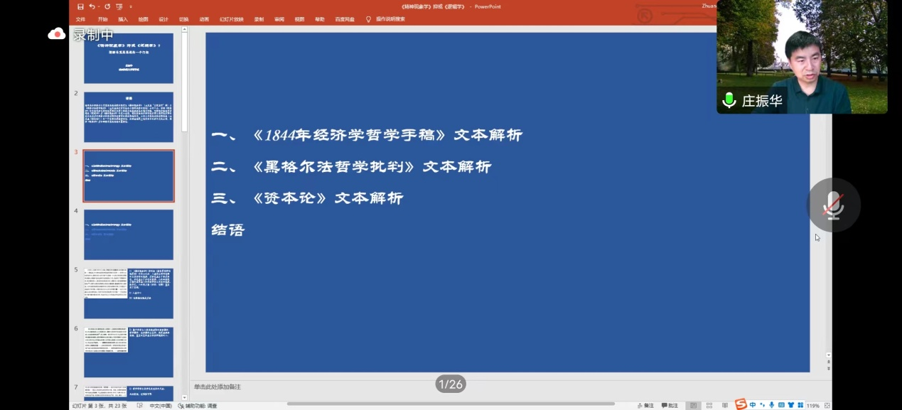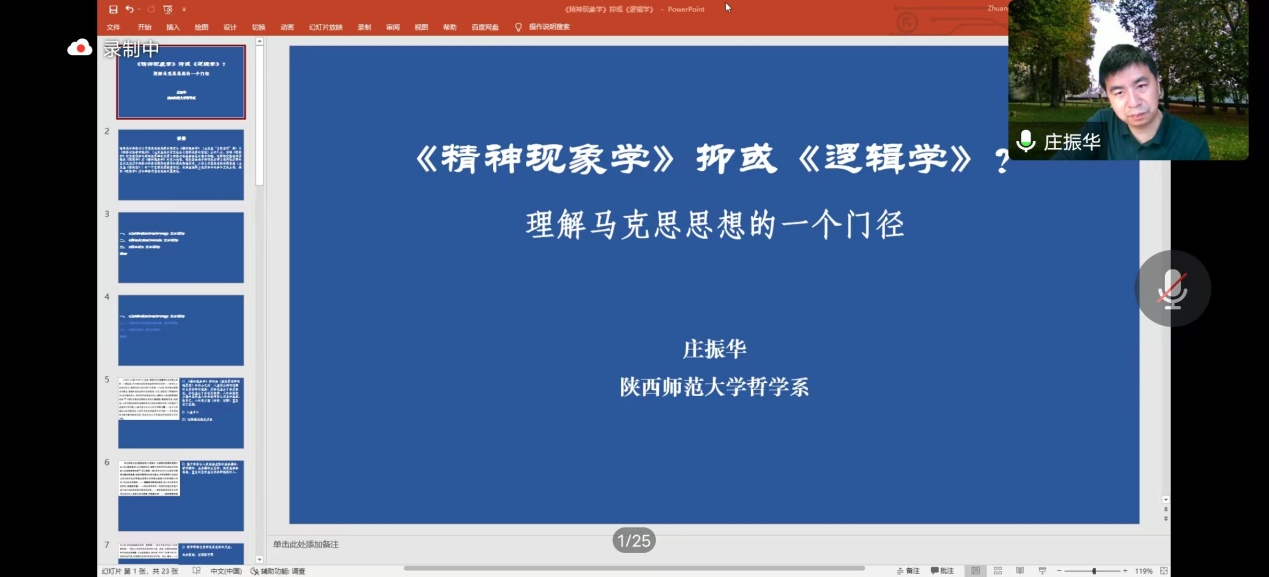 11月21日下午,应bv伟德国际1946邀请,陕西师范大学庄振华教授线上为公司师生作了题为《<精神现象学>抑或<逻辑学>?——理解马克思思想的一个门径》的学术讲座,此次讲座由bv伟德国际1946马俊峰教授主持。