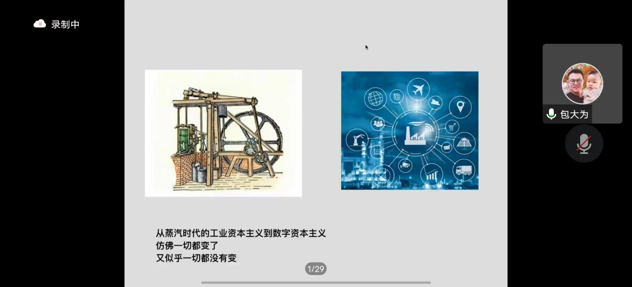 11月24日下午,应bv伟德国际1946邀请,浙江大学包大为研究员线上为公司师生作了题为《资本主义的数字生产及其危机逻辑》的学术讲座,此次讲座由bv伟德国际1946马俊峰教授主持。