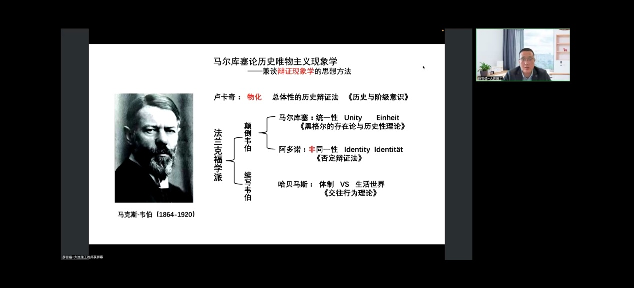12月5日下午,应bv伟德国际1946邀请,大连理工大学薛晋锡副教授线上为公司师生作了题为《马尔库塞论历史唯物主义现象学——兼谈辩证现象学的思想方法》的学术讲座,此次讲座由bv伟德国际1946马俊峰教授主持。