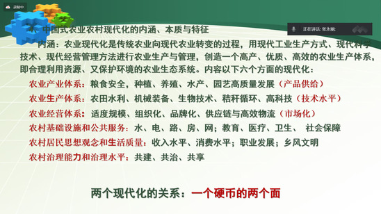 张永丽教授以“资源约束条件下农业农村现代化路径研究”为主题,深刻剖析了中国农村农业现代化面临的问题与困境并提出了解决路径。首先,张永丽教授从经济学视角阐述了农业农村现代化路径研究的理论基础,为我们对本研究的理解提供了全新的视角。其次,以英国、法国、日本等国家的农业农村现代化进程为例,从比较的视角重点阐释了中国式农业农村现代化的内涵、本质与特征。基于此,从土地资源、劳动力资源、资本投资、技术水平以及城乡收入差距问题、城乡基础设施建设滞后问题、城乡公共服务不均问题、农村环境问题等方面深刻剖析了中国农业农村现代化面临的资源约束与困境。最后,重点围绕处理好城市与乡村、工业与农业、政府与市场三大关系,加快土地制度改革、户籍制度、社会福利制度三大改革,提升生产价值、生活价值、生态价值三方面详细讲述了资源约束条件下实现中国农业农村现代化的发展路径。