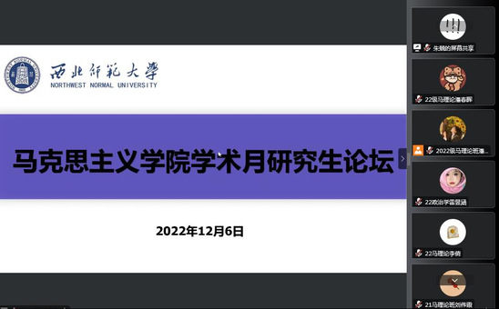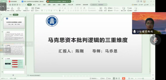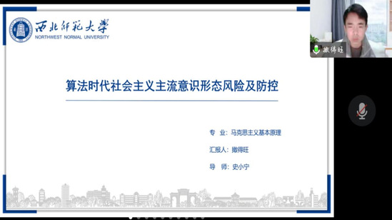 24名硕士研究生分别就个人研究方向及论文成果进行了学术交流汇报,分别作了“算法时代社会主义主流意识形态风险及防控”“马克思资本逻辑批判的三重纬度”“新时代中国共产党人民观的当代价值与践行路径”“筑牢中华民族共同体的理论认识和实践道路”“新时代增强党的思想引领力有效路径探析”“中国共产党进行自我革命的逻辑理路”等主题的研究成果汇报,表现出较好的专业素质和学术基础。