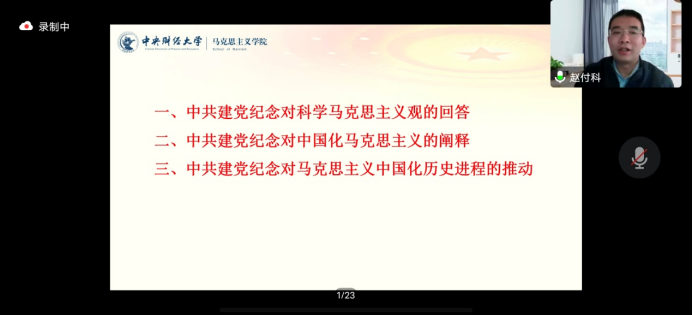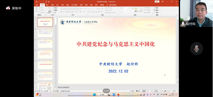 12月2日下午,应bv伟德国际1946邀请,中央财经大学赵付科教授线上为公司师生作了题为《中共建党纪念与马克思主义中国化》的学术讲座,此次讲座由bv伟德国际1946马俊峰教授主持。