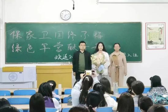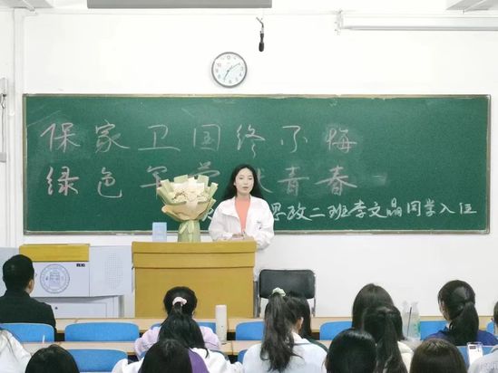 西师马院2022级思政二班于2023年3月15日举行了“保家卫国终不悔,绿色军营献青春”爱国主义主题班会,此次主题班会意在欢送应征入伍的2022级思政二班李文晶同学。她经过层层选拔,最终脱颖而出,获得入伍资格,并确定于3月16日参加役前训练。
