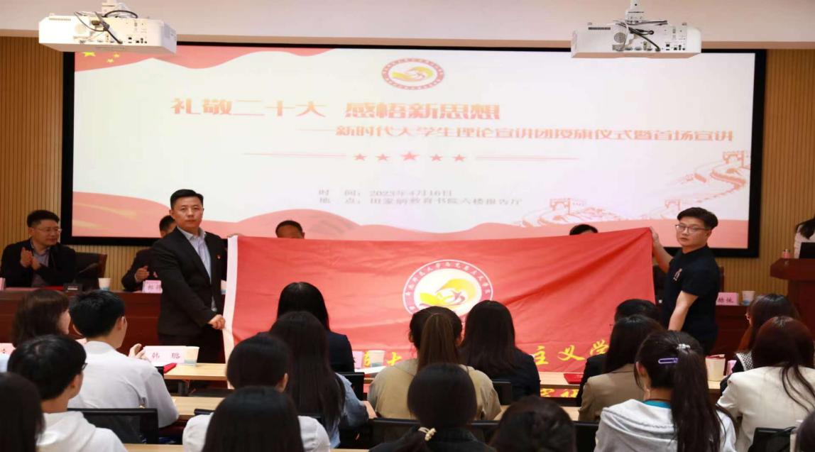 为进一步学习贯彻习近平新时代中国特色社会主义思想,深入贯彻落实党的二十大精神,强化青年学子的政治品格,提升老员工政治理论水平,做好党的创新理论和重大会议的理论阐释工作,以青年视角宣传阐释党的二十大精神及一系列党的创新理论,用通俗易懂的语言、身边的鲜活故事、喜闻乐见的形式,讲“透”讲 “精”讲“活”党的创新理论,充分发挥朋辈教育作用,彰显bv伟德国际1946“思政育人”的学科优势,进一步凸显bv伟德国际1946“新时代老员工理论宣讲团”的品牌效应。2023年4月16日下午,bv伟德国际1946新时代老员工理论宣讲团在田家炳教育书院6楼报告厅隆重举行了授旗仪式暨首场宣讲。