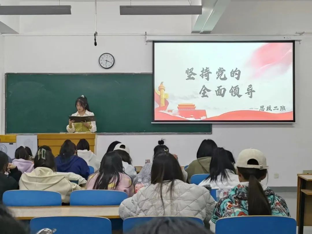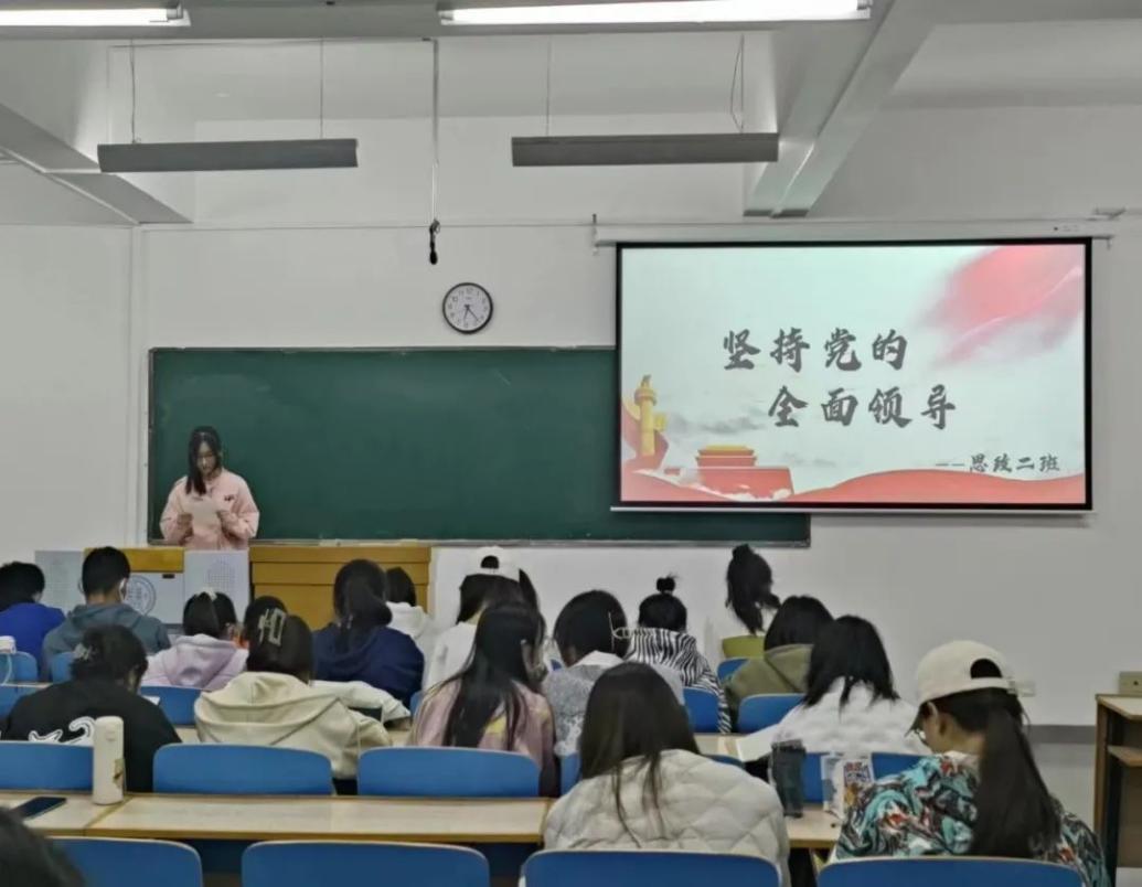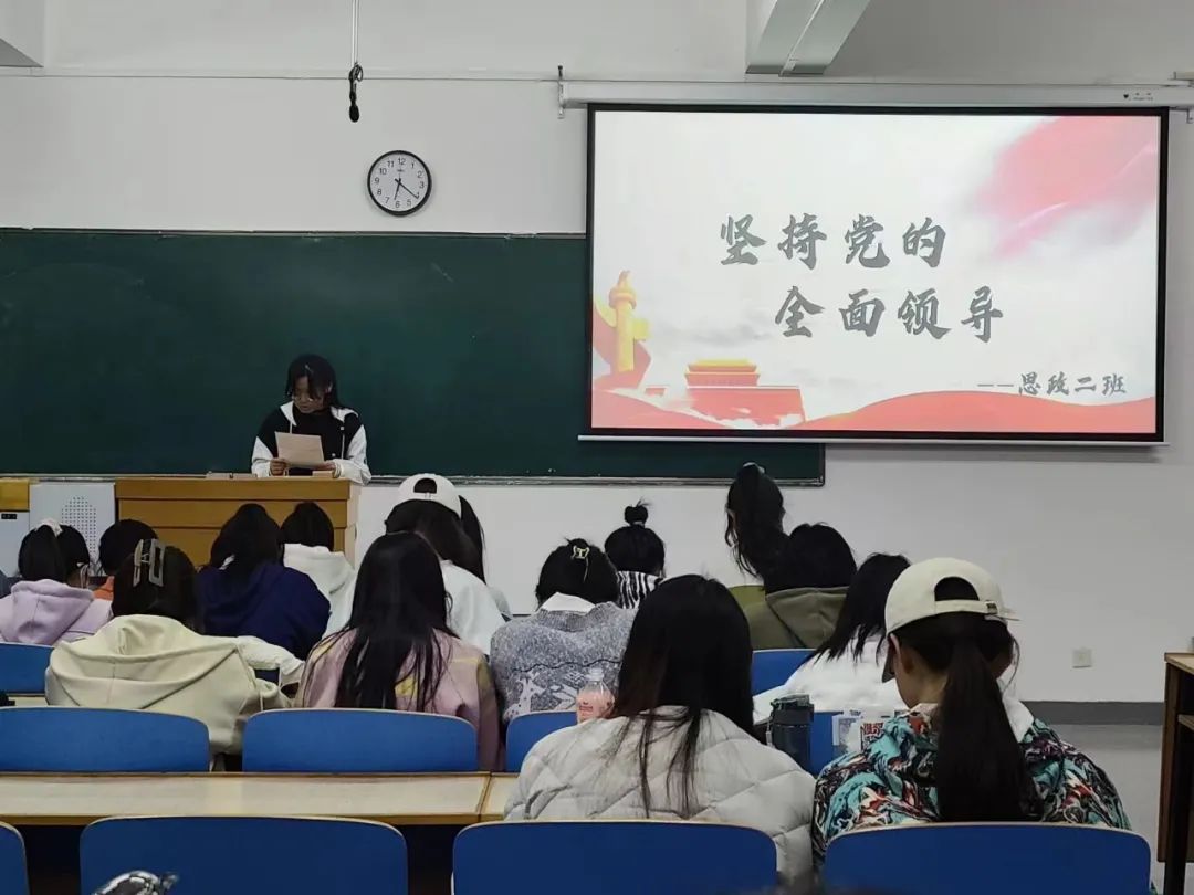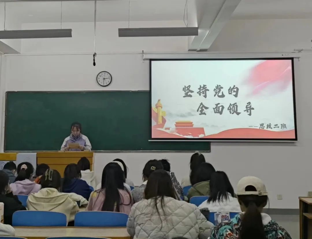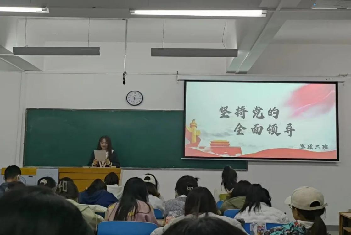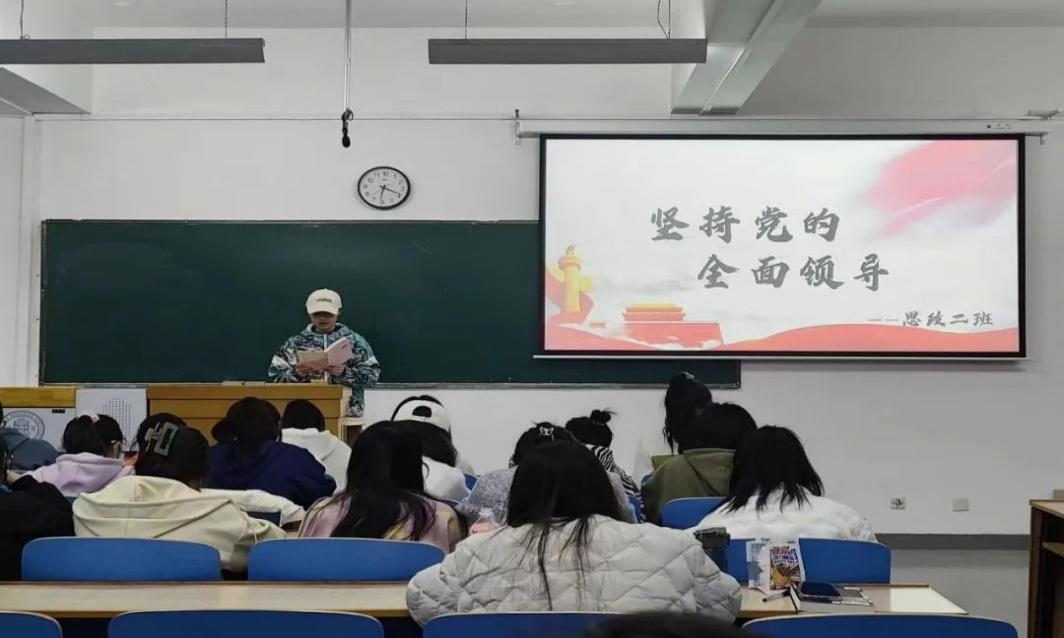 春风化雨,词润人心。读原著、学原文、悟原理、知原义,是深入学习习近平新时代中国特色社会主义思想的重要途径。2022级思政2班同学从学习《习近平谈治国理政》第四卷入手,锤炼了党性,坚定了政治信仰,从忧患意识,初心使命,人民立场,理想信念等方面做了分享交流,并从“坚持党的全面领导”方面做了重点阐释。