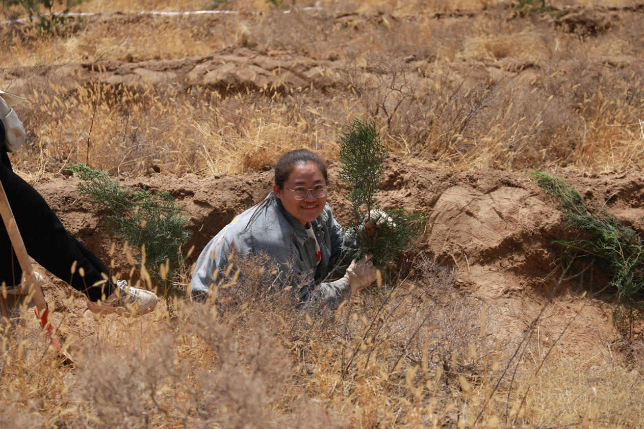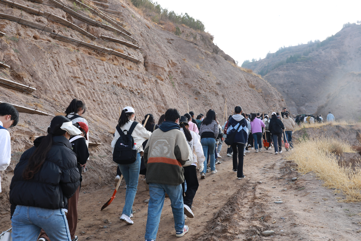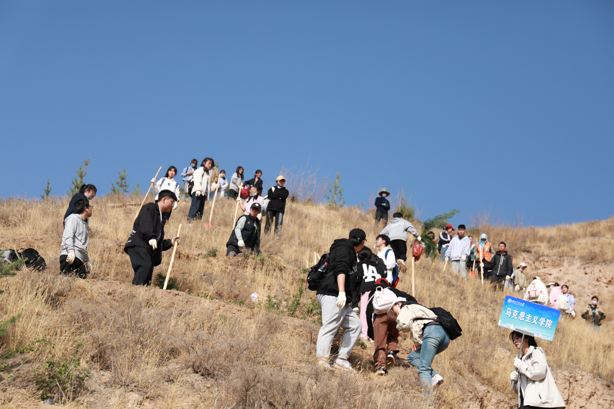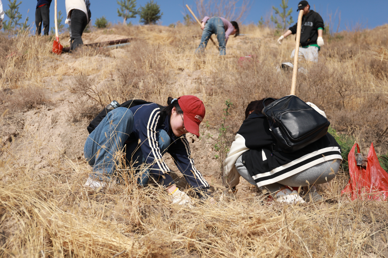 尽管汗流浃背,但同学们依然挥动铁锹,沉浸在植树的喜悦之中,整个植树现场呈现出一片热火朝天的景象。在大家的辛勤劳动下,百余株树苗在“山间沟壑”上“安家落户”,为兰州的春天再添一片新绿,焕发出勃勃生机。