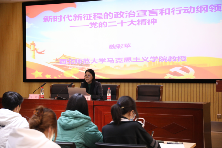 魏彩苹教授从“举世瞩目的盛会、过去的成就、实现小康的战略部署、对外开放、文化以及社会民生建设”等方面,全面、系统、深刻地讲解了二十大的重大意义、核心内涵,深入浅出、点面结合,以系统的理论思维、开阔的学术视野、生动的案例分析,讲深、讲活、讲透了党的二十大精神,号召同学们学习贯彻党的二十大精神,要结合实际,真正做到学、思、用贯通,知、信、行合一,学出使命,学出担当。