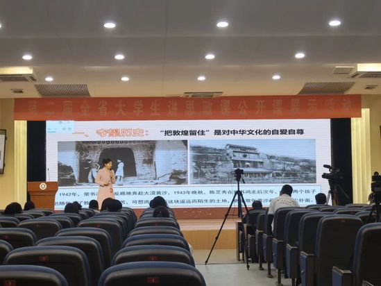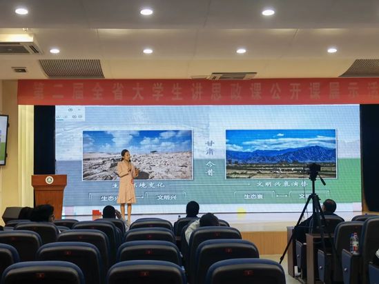 在决赛现场,夏宇同学以敦煌一代代“面壁人”孜孜不倦、精益求精,洞中一日,笔下千年的故事为引,以“敦煌的守护神”常书鸿先生用一生守护敦煌莫高窟的故事为主线,结合党的二十大精神、甘肃省第十四次党代会精神关于文化建设的重要论述,展现了西师青年的蓬勃朝气和文化自豪感。刘莹雪同学则围绕习近平总书记关于生态文明建设的一系列讲话精神,着力阐述了生态文明建设的甘肃实践,呼吁新时代青年用理论武装头脑,一起做习近平生态文明思想的践行者。两位同学的讲述入情入理、声情并茂,获得了大赛评委的一致肯定。