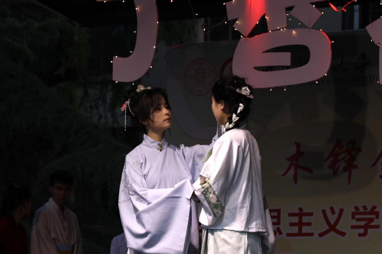 情景剧《木兰辞》以木兰替父出征为背景,将中华传统美德忠孝精神融入到独特的艺术形式中,演绎了巾帼须眉创造历史的精彩一幕,激励青年赓续爱国精神,谱写新时代青年的青春华章。从盛世大唐到民国青年之思再到当今华夏,马院学子以青年的朝气诵读出对先辈的无限敬仰,激励青年要敢想敢为、善作善成,在建设社会主义现代化强国的征程中勇担重任,奉献青春。
