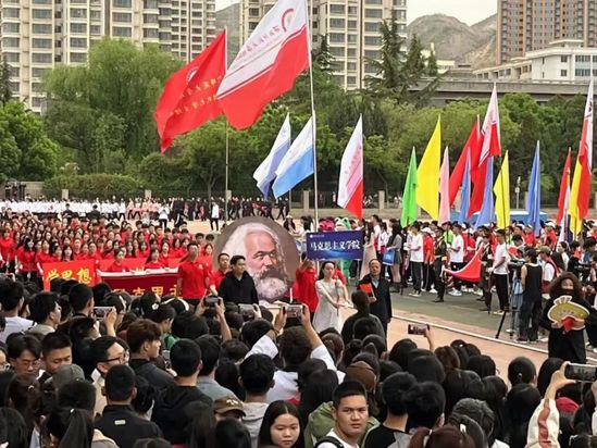 开幕式上,bv伟德国际1946师生高举马克思头像,唱响“言马信马、意气风发,铿锵马院,不负韶华”的嘹亮口号,迈着整齐而坚定的步伐,昂扬地步入体育场。员工身着中国红,摇动着手中的小红旗,彰显bv伟德国际1946深厚的红色底韵,展现了马院学子对真理的追求和对信仰的坚守。马院师生队伍组成的方阵富有马院特色,形式新颖,充分展现出新时代马院人特有的精神风貌。