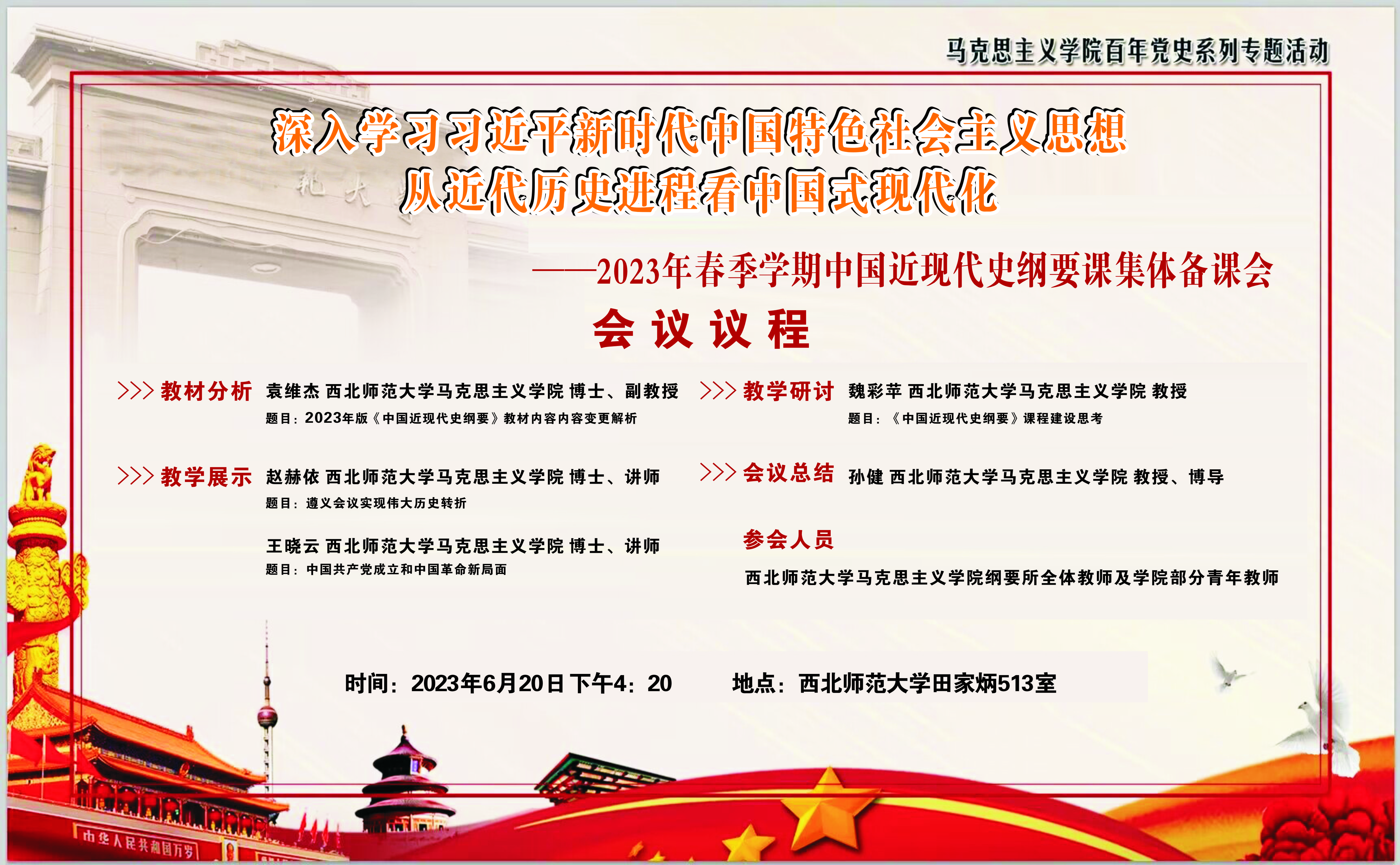 6月20日下午,bv伟德国际1946中国近现代史纲要研究所全体教师及兼职教师召开了“深入学习习近平新时代中国特色社会主义思想——从近代历史进程看中国式现代化”为主题的集体备课会。此次备课会由中国近现代史纲要研究所所长闪兰靖副教授主持。