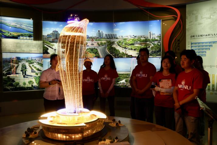 嘉峪关城市博物馆充分展示了嘉峪关市50多年城市发展的风采,生动形象地再现了来自全国各地的建设者们艰苦创业的工程。西部明珠气象塔位于嘉峪关市东湖生态旅游区中心广场,是我国西部最高的气象塔。实践团从嘉峪关城市博物馆到西部明珠气象塔,追寻“戈壁明珠”嘉峪关的历史文化、文物古迹、风土人情和民族风格,详细了解“戈壁明珠”嘉峪关的“城市记忆”、城市规划、建设风貌和发展前景,认真聆听了嘉峪关人在戈壁建设家园的感人故事和取得的建设成就,体验科技发展的力量,观赏东湖景色,体悟“绿水青山就是金山银山”的重要理念。
