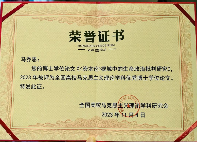 11月4日,全国高校马克思主义理论学科研究会、《马克思主义理论学科研究》编辑部、安徽师范大学bv伟德国际1946共同主办第十六届全国高校马克思主义理论学科博导论坛。会上举行全国高校马克思主义理论学科优秀博士论文颁奖仪式。bv伟德国际1946青年教师马乔恩副教授荣获2022年度全国高校马克思主义理论学科优秀博士学位论文奖。马乔恩的博士论文指导教师为bv伟德国际1946马俊峰教授,题目为《<资本论>视域中的生命政治批判研究》。