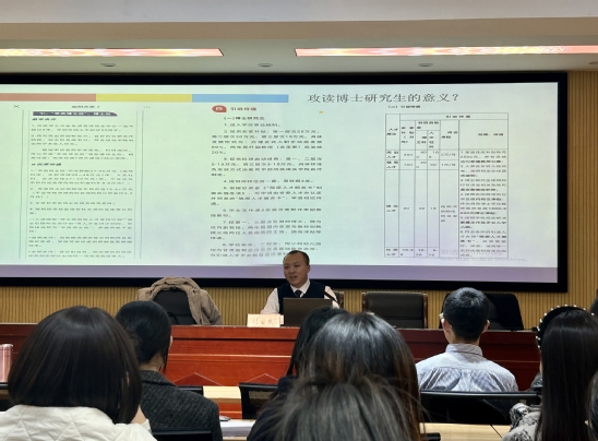 博士生王涛作了题为《马克思主义理论专业考博全攻略》的报告。王涛同学首先介绍了攻读博士研究生的意义、困难与前景,引发同学们对读博的思考。随后,他详细解读了申请读博的两种方式——统考制与审核制。紧接着,他梳理了申请马克思主义理论专业博士的必备条件,即英语水平、科研成果、读博计划书、专家推荐信等。最后,就如何系统科学地备考给出许多针对性的建议,例如备考时间要趁早、做好信息收集等。