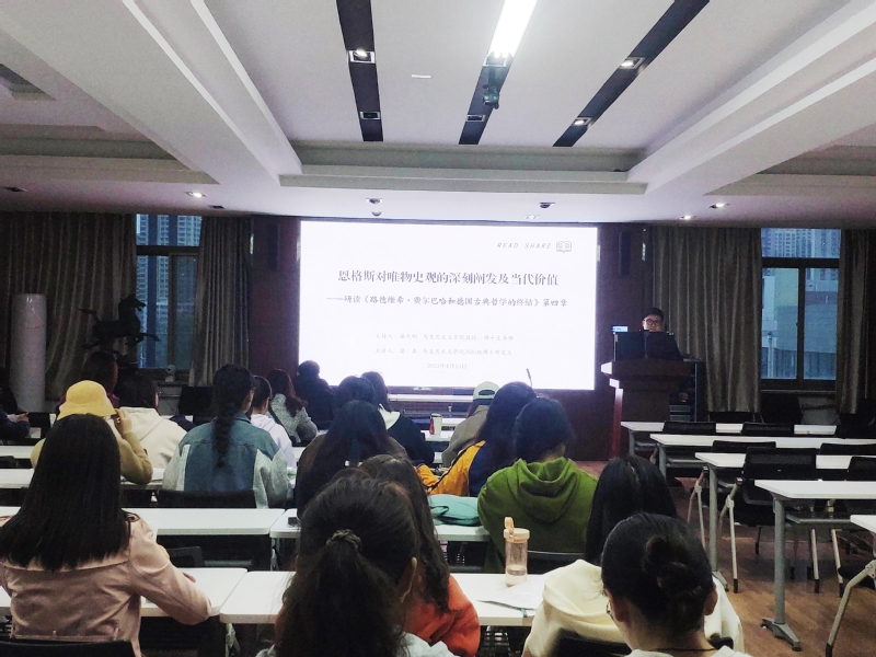 4月13日晚,第三十七期马克思主义经典读书会在田家炳教育书院607图书资料室举行。2020级博士研究生梁真以《恩格斯对唯物史观的深刻阐发及当代价值》(下)为题,对《路德维希·费尔巴哈和德国古典哲学的终结》(以下简称《费尔巴哈论》)第四章进行文本分析。读书会由博士生导师岳天明教授主持,公司近六十余名硕博士研究生参加了读书会。