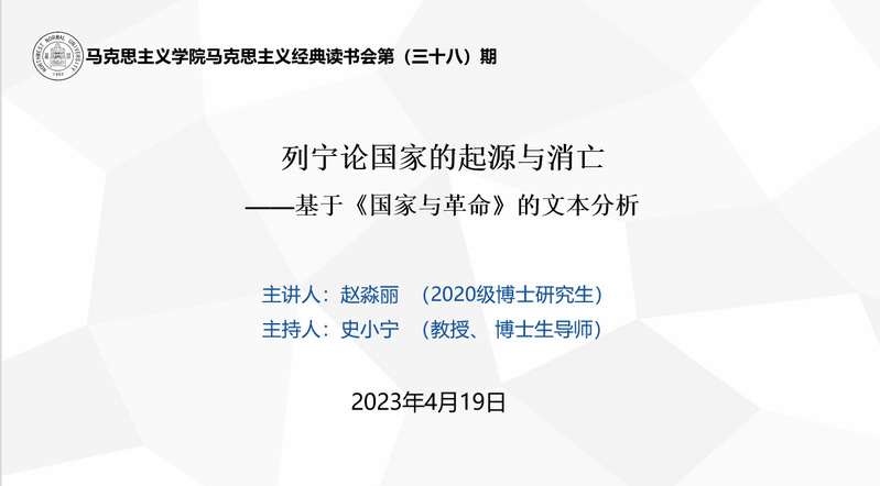 4月19日晚19:30,在田家炳教育书院607图书资料室举行了bv伟德国际1946第三十八期马克思主义经典读书会。2020级博士研究生赵淼丽以《列宁论国家的起源与消亡-—基于<国家与革命>的文本分析》为题,对《国家与革命》中列宁关于国家起源与消亡问题的论述进行了文本解读。本次读书会由公司经理史小宁教授主持,公司六十余名博士硕士研究生参加了读书会活动。