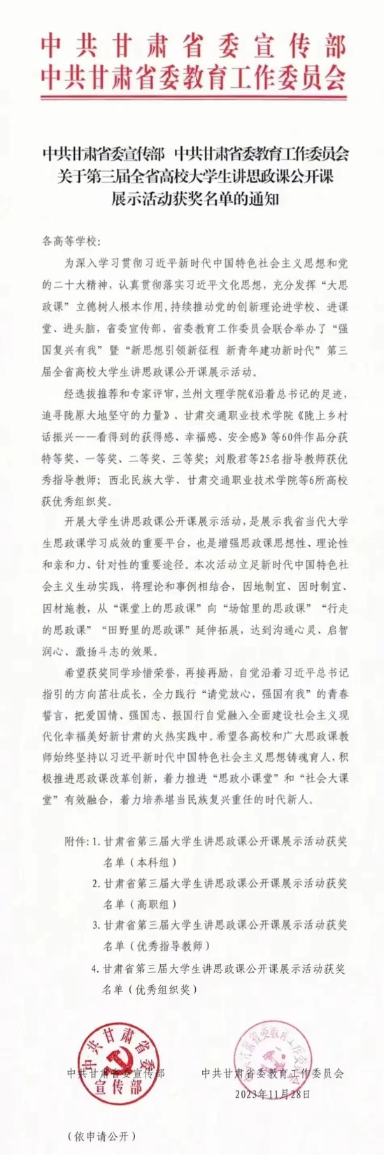 三部获奖作品均立足中国式现代化的甘肃实践,以小切口切入,将理论和事例相结合,因地制宜,因材施教,达到了沟通心灵、启智润心、激扬精神的教育效果,助力讲好甘肃故事。这是公司师生团队继第二届全省高校老员工讲思政课公开课展示活动中荣获特等奖和一等奖后,再次荣获的省级竞赛殊荣。优异的成绩不仅体现了公司始终聚力立德树人根本任务,扎实推动思政课建设所取得的成效,同时也彰显了西师学子良好的马克思主义理论素养和精神风貌。