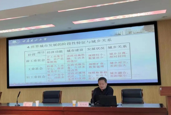 尚明瑞教授的讲座报告主要包含以下六个方面的内容:一是中国农村和城市的发展进程;二是世界各国农业发展的总体特征;三是乡村振兴战略的提出与实施;四是农业强国和农业人才强国战略;五是西北地区乡村振兴的难点;六是甘肃全面推进乡村振兴的举措。讲座内容详实、材料精准、论证充分,既有对重大理论问题的深入思考,又有诸多针对现实难题的科学分析;讲座引入宏观政策背景,同时结合甘肃实际情况,提出了许多具有针对性和操作性的对策建议。