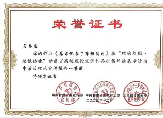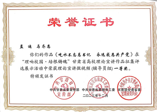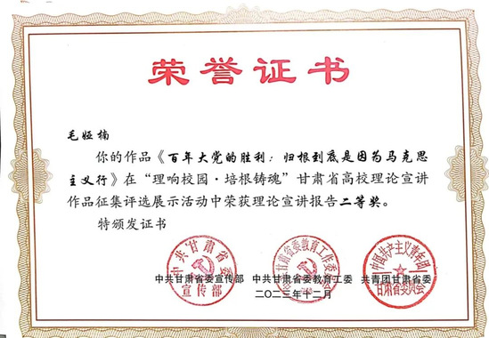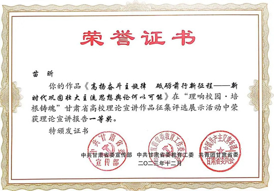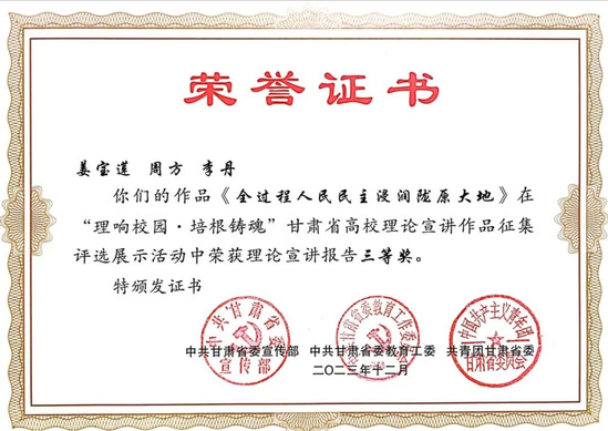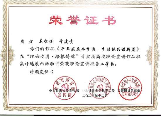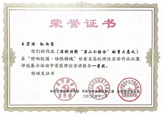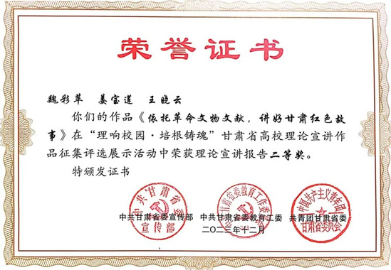 公司党委副书记王宏渊、孙雨蕾老师的作品《深刻理解“第二个结合”的重大意义》,马乔恩教授的作品《总书记来了布楞沟村》,苗昕老师的作品《高扬奋斗主旋律 砥砺前行新征程——新时代巩固壮大主流思想舆论何以可能》荣获理论宣讲报告一等奖;毛娅楠老师的作品《百年大党的胜利:归根到底是因为马克思主义行》,周方、姜宝莲、于建贵老师的作品《千年夙愿今梦圆,乡村振兴谐新篇》,魏彩苹、姜宝莲、王晓云老师的作品《依托革命文物文献,讲好甘肃红色故事》荣获理论宣讲报告二等奖;姜宝莲、周方老师和李丹同学的作品《全过程人民民主浸润陇原大地》荣获理论宣讲报告三等奖。