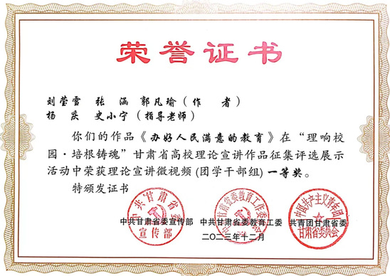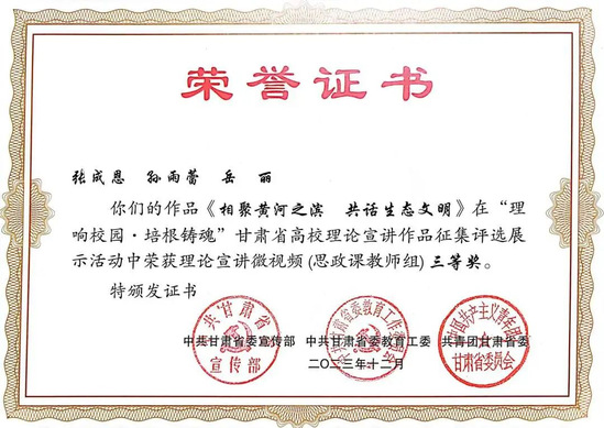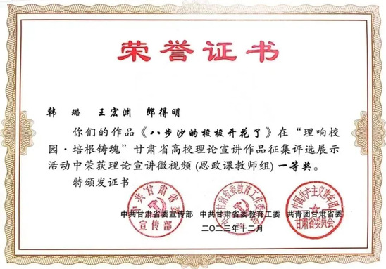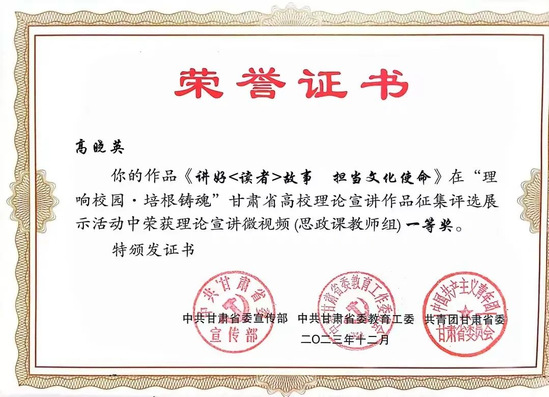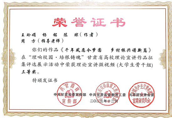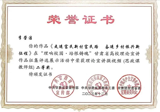 韩璐老师的作品《八步沙的梭梭开花了》,高晓英老师的作品《讲好〈读者〉故事文化使命》荣获理论宣讲微视频“思政课教师组”一等奖;孟迪、马乔恩老师的作品《吃水不忘总书记 永远感恩共产党》荣获理论宣讲微视频“辅导员组”一等奖;刘莹雪、张涵、郭凡瑜同学的作品《办好人民满意的教育》荣获理论宣讲微视频“团学干部组”一等奖;李莹洁老师的作品《走进富民新村富民路 奋进乡村振兴新征程》荣获理论宣讲微视频“思政课教师组”二等奖;张成恩、孙雨蕾、岳丽老师的作品《相聚黄河之滨 共话生态文明》荣获理论宣讲微视频“思政课教师组”三等奖;王玲娟、杨铭、陈琼同学的作品《千年夙愿今梦圆 乡村振兴谱新篇》荣获理论宣讲微视频“老员工骨干组”三等奖。