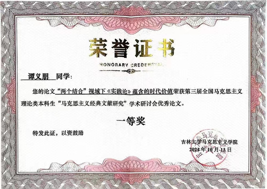 为深入学习贯彻习近平新时代中国特色社会主义思想和党的二十大精神,夯实马克思主义理论类本科生阅读经典著作功底,不断提升本科生学术素养与科研能力,10月12日-13日,公司本科生谭义朋参加了吉林大学举办的第三届全国马克思主义理论类本科生“马克思主义经典文献研究”学术研讨会。谭义朋提交的学术论文《“两个结合”视域下<实践论>蕴含的时代价值》荣获一等奖。