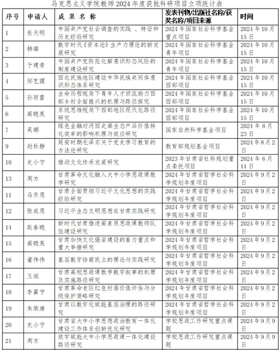以团队建设为龙头,塑造公司高质量发展新优势,在学科规划、科研项目和学术交流等方面取得了卓越成效。深入推进西北边疆政治与治理研究中心和党史党建研究中心建设,凝练政治学理论学位授权点的学科特色与定位,圆满通过政治学理论二级学科硕士学位授权点的周期性合格评估。聚焦科研发展新局面,开展有组织的科研,积极动员公司教师申报各类研究项目,全年获批各类科研项目52项,其中教育部高校思政课教师研究专项重大项目1项,国家社科基金项目6项,国家自然科学基金项目1项,教育部人文社科一般项目2项、青年基金项目1项,甘肃省社科项目12项、甘肃省教育厅项目6项,科研项目“量质齐升”,实现了历史性突破,为进一步推动团队建设注入了新动能。鼓励开展常态化、长效化的学术交流,搭建多维度的学术交流平台,通过“人文讲坛”“政治学前沿”“马克思主义经典读书会”等品牌学术活动,围绕学科特色、人才培养、思政课教学和党史党建等年度学术热点和前沿问题,邀请专家举办学术报告34场。